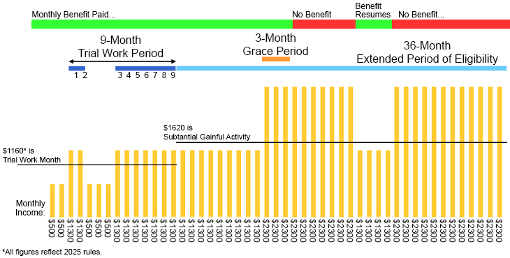 Ruth explained to her benefits counselor that she'd be earning $1,300 in some months, less in others, depending on her schedule. The counselor explained that while $1,300 was higher than SSDI's Trial Work month level ($1,160 in 2025), that wasn't a problem: Ruth could earn more than the Trial Work Month level nine times in five years (sixty months) and keep getting SSDI benefits no matter how much she earned. During this five-year Trial Work Period (TWP), it didn't matter whether the nine Trial Work months were in a row or spread out.
